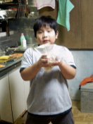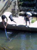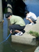 今朝は近所のおばちゃんから、採れたてのキャベツをいただきました。小さいけれど新鮮、外側のはっぱを剥いたら、パリっと音がしました。青虫つきです、美味しい証拠ですね。 お墓参りの後、ウロウロと歩き回っていると、川の流れの中に魚を発見!! しか~し、自然の中で育っている魚たちが、そういう経験の全く無い子供達に、そう簡単に捕まるはずも無く、たまに網の中に入るのは、川底の石ころだけ。
